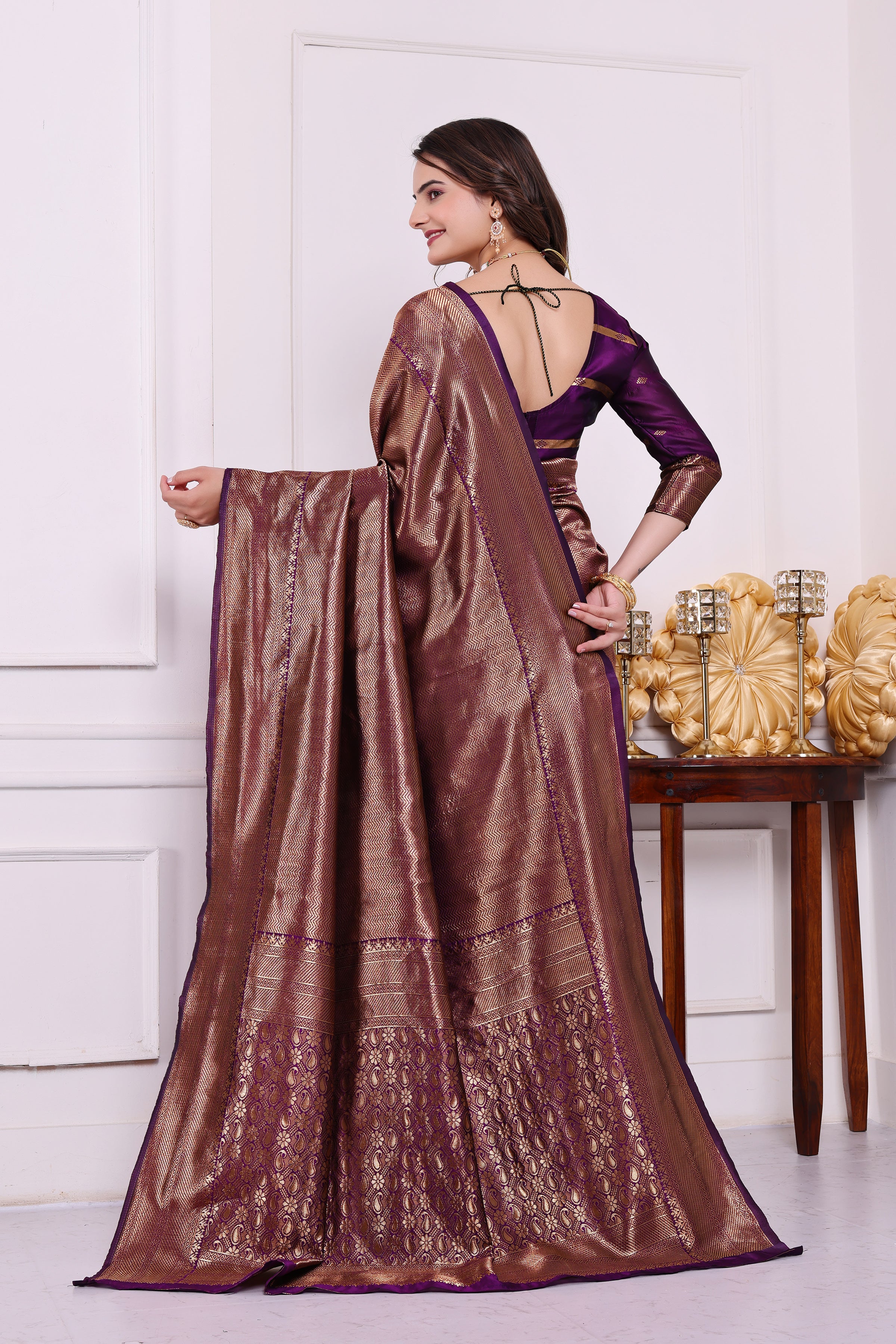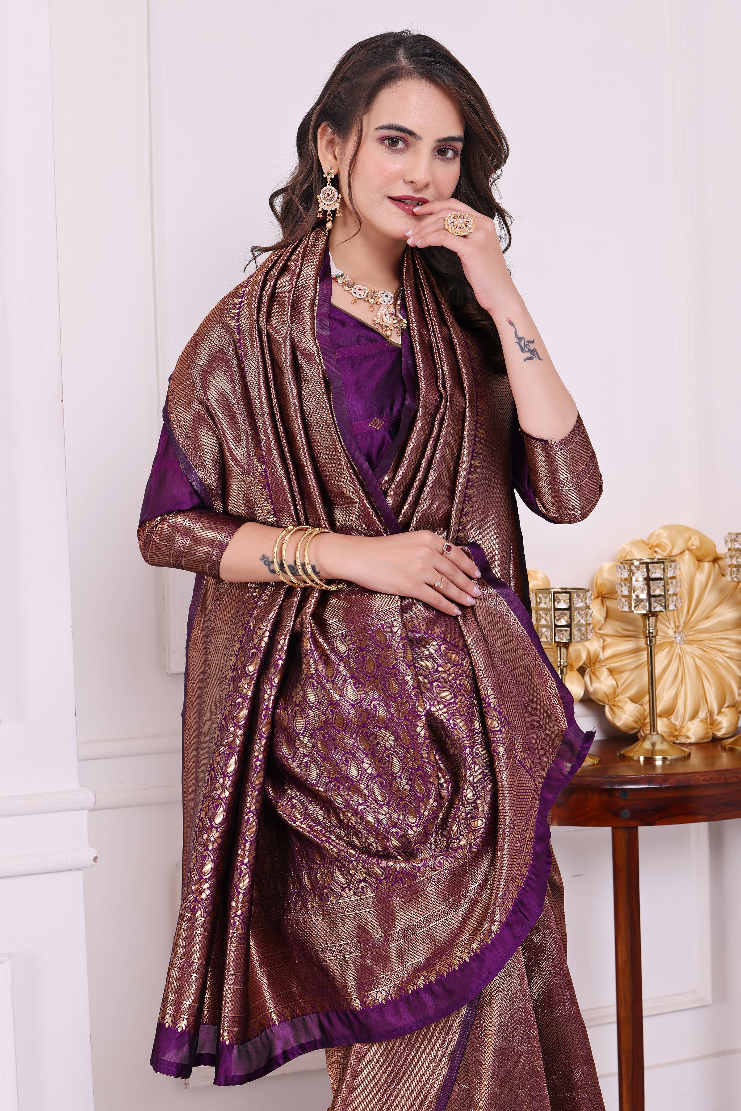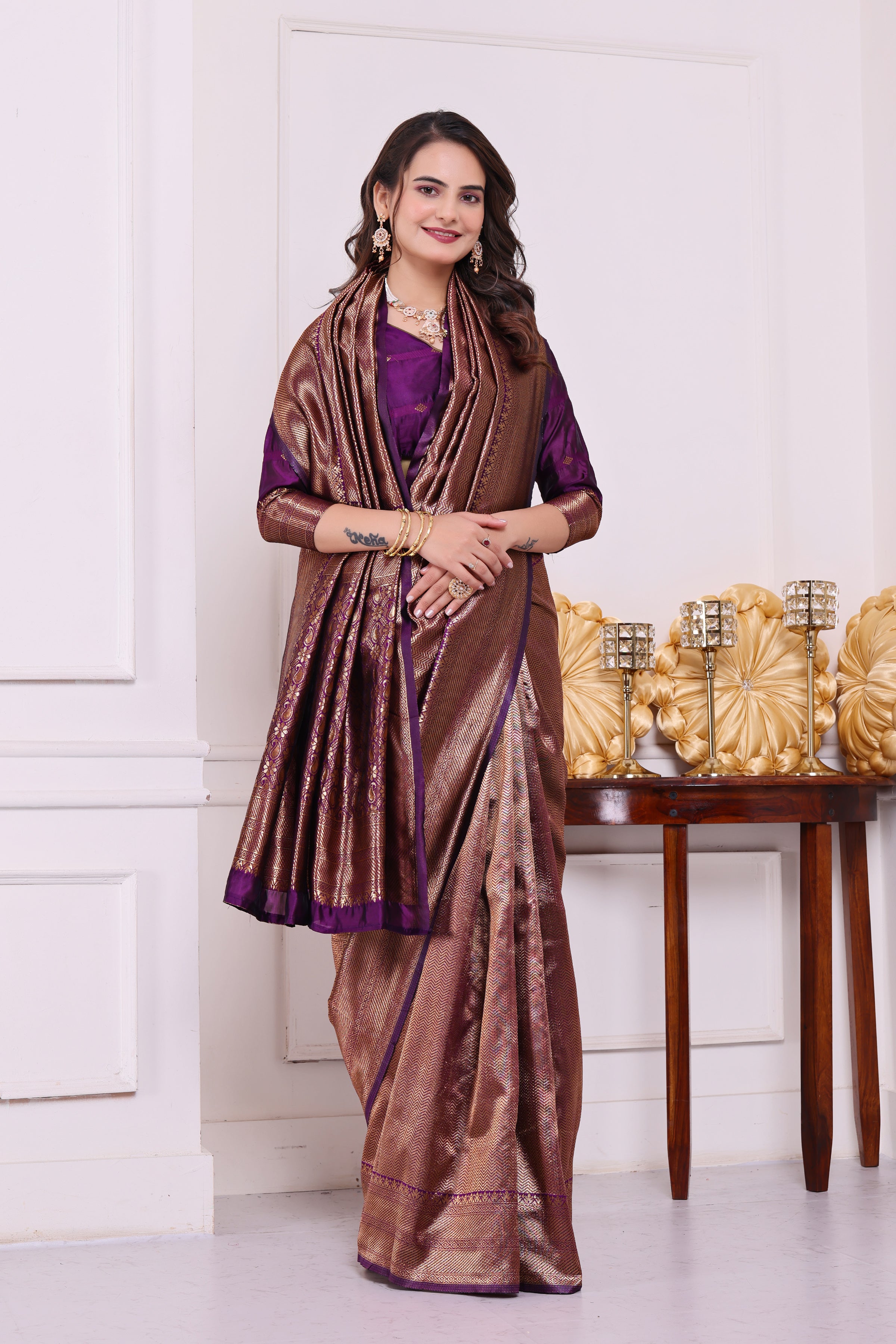Step into timeless elegance with this luxurious Aarohi Wine Banarasi silk saree, an epitome of royal charm and intricate craftsmanship. Woven with precision, the fabric features a delicate interplay of shimmering copper and deep indigo-blue tones, creating a rich, luminous texture that catches the light beautifully. The body of the saree is adorned with fine, all-over zari work in traditional patterns, giving it an opulent and refined finish.