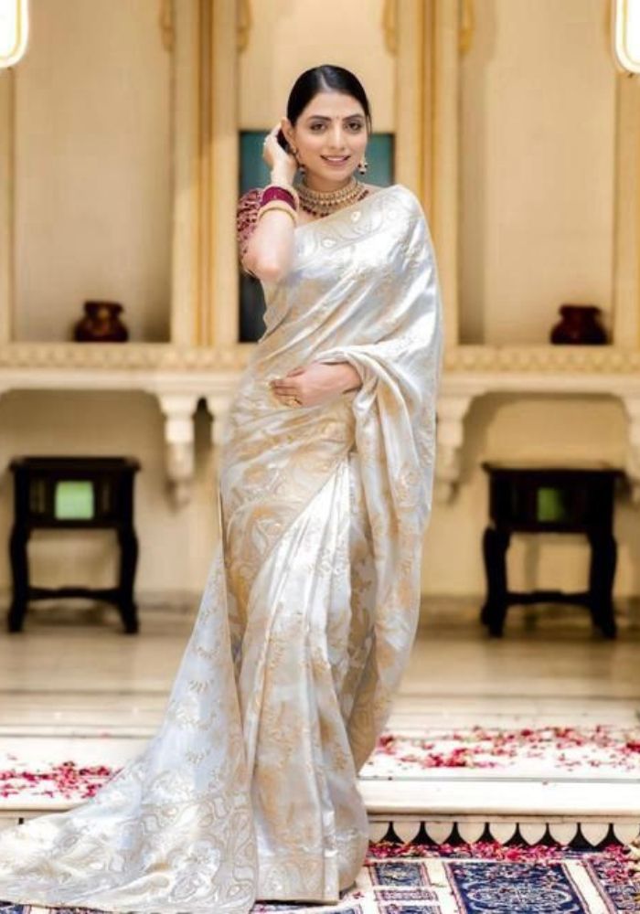 This elegant saree is a timeless piece that showcases the richness of traditional Indian craftsmanship. Made from luxurious White banarasi silk, it features intricate golden zari work throughout, forming delicate floral and paisley motifs. The broad border and pallu are heavily adorned with elaborate patterns, adding a regal touch to the overall design. Paired with a matching blouse embellished with complementary golden embroidery, the ensemble exudes sophistication and grace. Perfect for weddings, festive occasions, or formal events, this saree effortlessly combines heritage with high fashion.