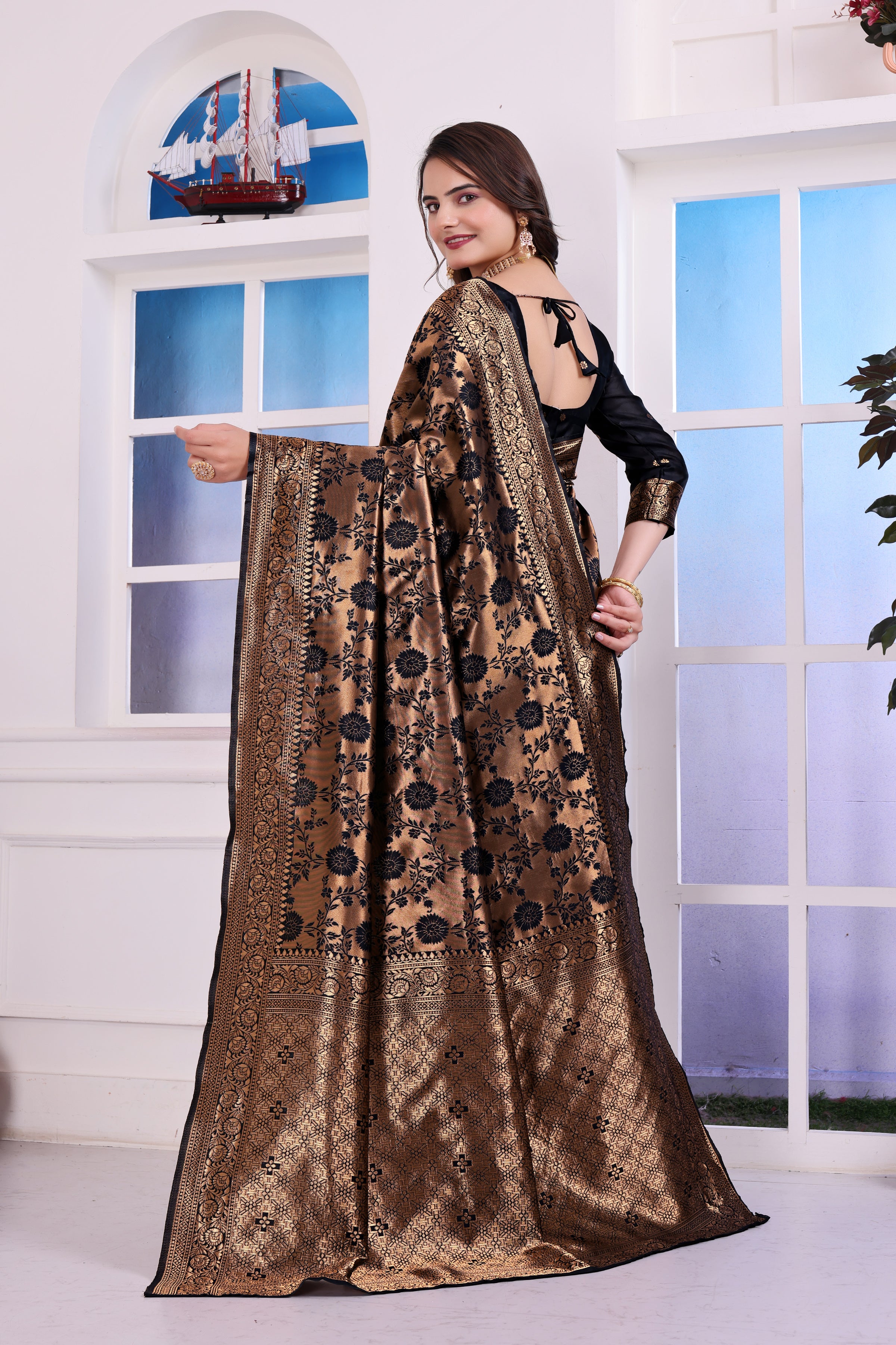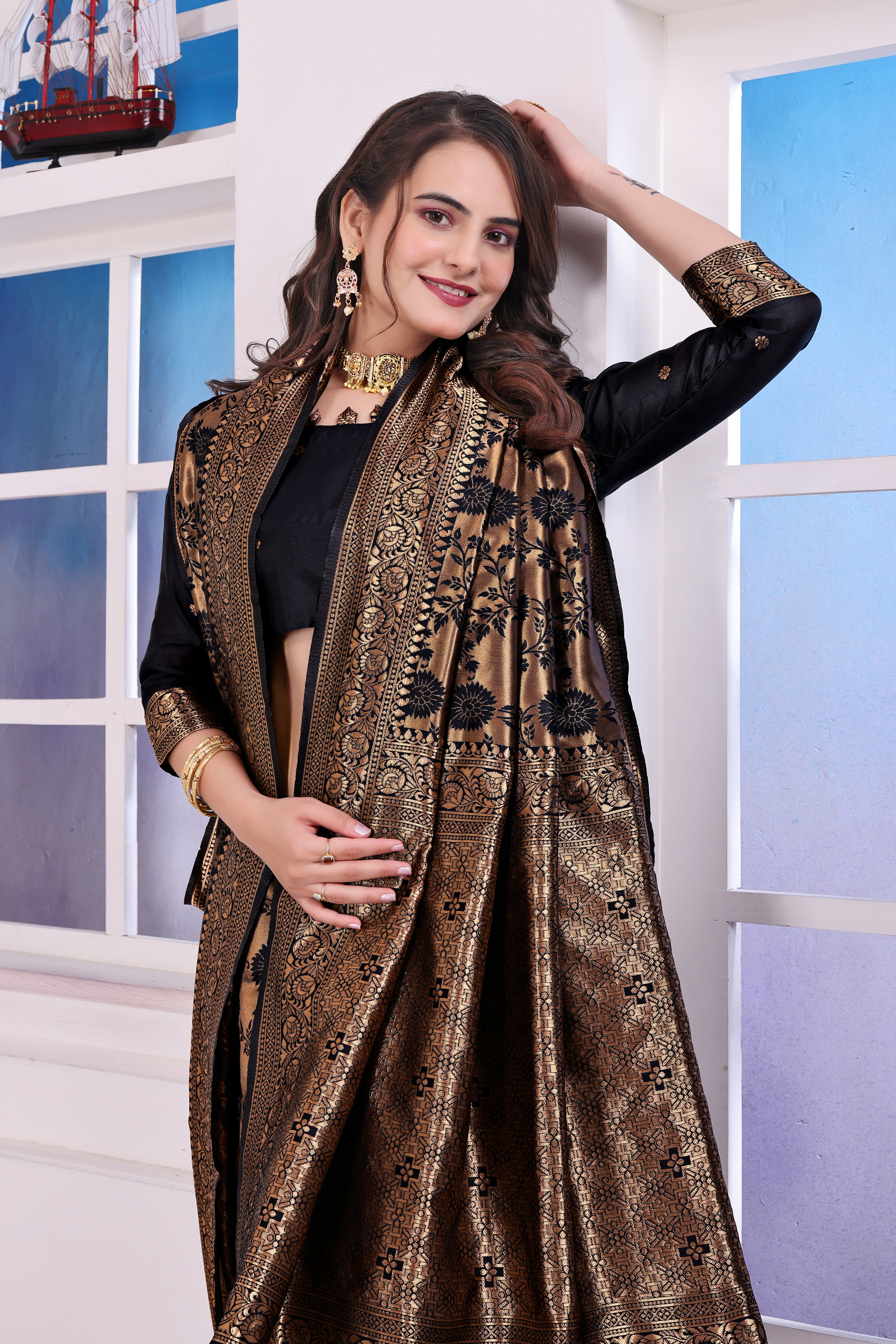 Drape yourself in the enchanting grace of the Antara Black Banarasi Silk Saree, a perfect harmony of tradition and sophistication. This stunning saree features a rich steel grey base beautifully contrasted with deep teal floral motifs and a lavishly woven zari border. The intricate craftsmanship and shimmering silk texture exude opulence, making it an exquisite choice for weddings, festive evenings, or grand celebrations. Pair it with antique gold jewellery for a truly regal appearance that leaves a lasting impression.