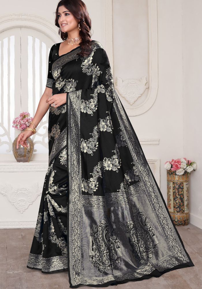 Elevate your elegance with this enchanting Aura Black Banarasi silk saree. Adorned with intricate golden zari motifs and regal border detailing, the saree exudes timeless charm and sophistication. The soft, lustrous fabric gracefully drapes the body, making it perfect for festive occasions, weddings, or grand celebrations. Paired with a matching blouse, this saree beautifully blends tradition with contemporary finesse, offering a look that’s both graceful and grand.