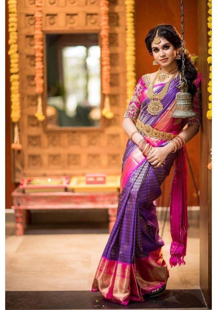 Drape yourself in timeless elegance with this stunning traditional Kanjivaram silk saree, a perfect blend of royal hues and rich craftsmanship. The body of the saree features a deep royal purple base adorned with intricate golden zari checks, creating a luxurious and regal look. The vibrant magenta pink pallu and border are accentuated with bold zari motifs and golden details, lending a striking contrast that adds depth and beauty.