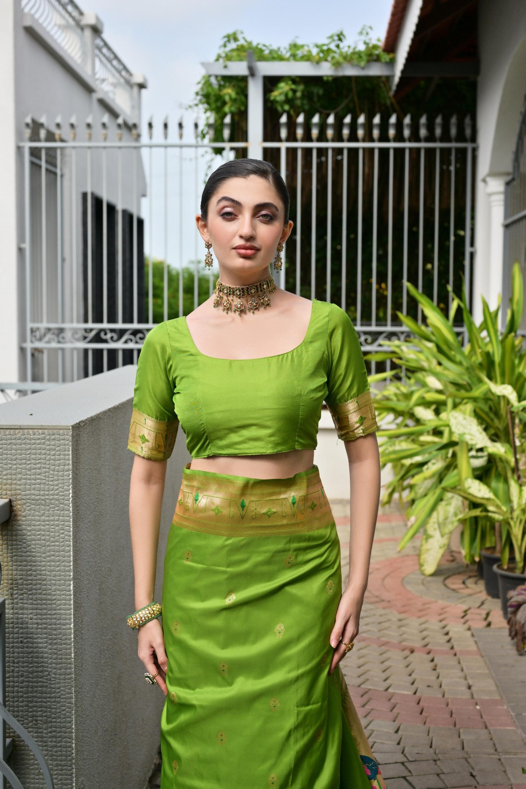 Embrace the grandeur of tradition with this Gladiolus Green Woven Paithani Saree, a masterpiece that beautifully blends heritage with artistry. The saree features intricate weaving, while the pallu is adorned with elegant peacock designs, symbolizing grace and prosperity. Perfect for weddings, festive occasions, and cultural celebrations, this Paithani drapes you in timeless charm.