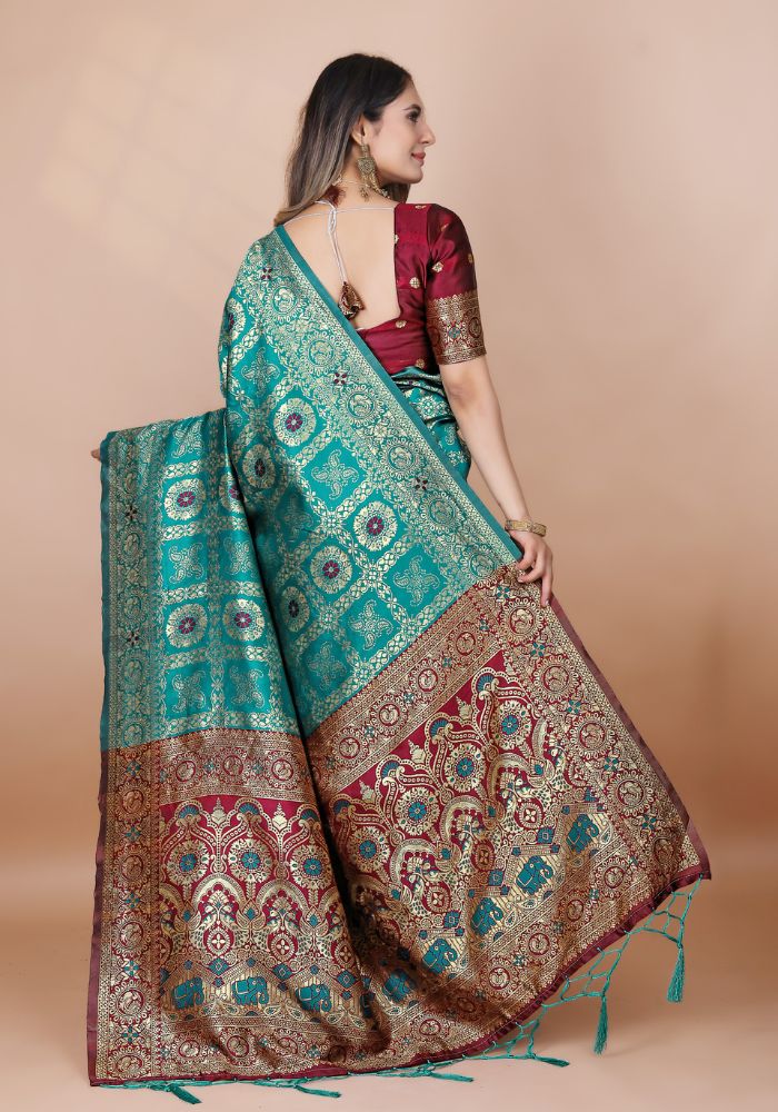 Radiate royal charm in this Heritage Kanchipuram Saree, an exquisite blend of tradition and grandeur. Woven in a rich turquoise silk base, the saree features intricate zari motifs laid out in symmetrical patterns reminiscent of palace art. The highlight is its striking maroon pallu adorned with grand elephant and floral motifs in gold zari—symbolizing prosperity and grace. Perfect for weddings, festive occasions, or regal evenings, this saree captures the soul of heritage in every thread. Pair it with traditional jewelry for a timeless, majestic look.