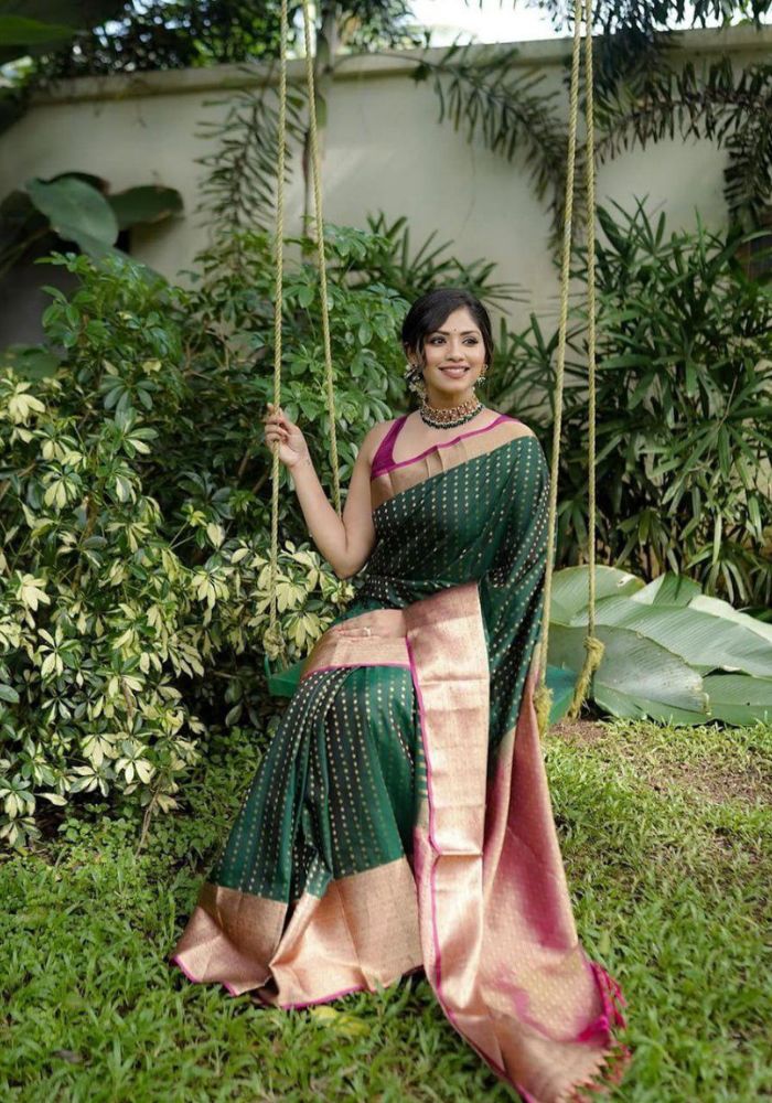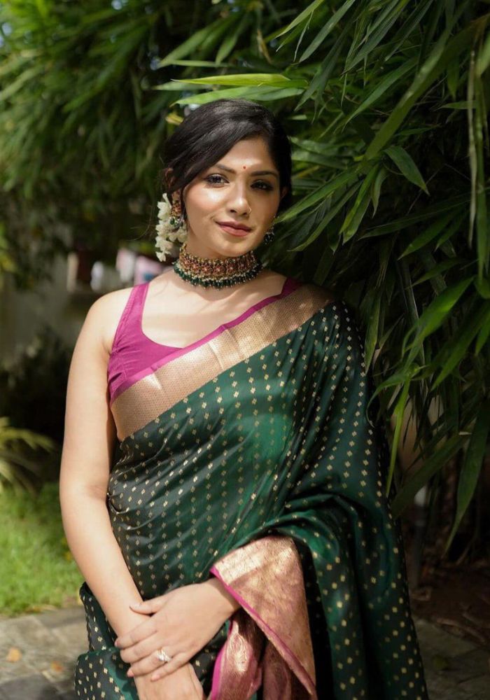 Elevate your ethnic wardrobe with our Capricious Dark Green Soft Silk Saree. This stunning saree comes with a lovely blouse piece, perfect for any special occasion. The rich dark green color and soft silk fabric will make you stand out in a crowd.