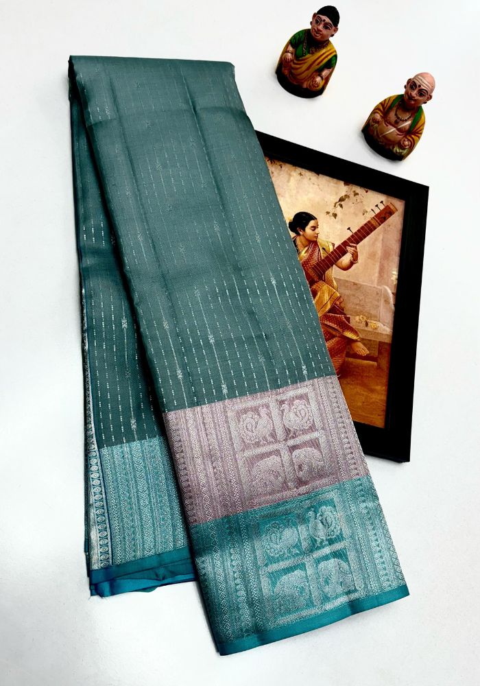 Graceful and enchanting, Ishira comes in a serene aqua teal shade, adorned with intricate silver zari weaving across the body. The pallu showcases elegant floral and geometric motifs, while the contrasting borders highlight traditional artistry. This saree radiates timeless sophistication, making it an ideal choice for weddings, festive occasions, and grand celebrations