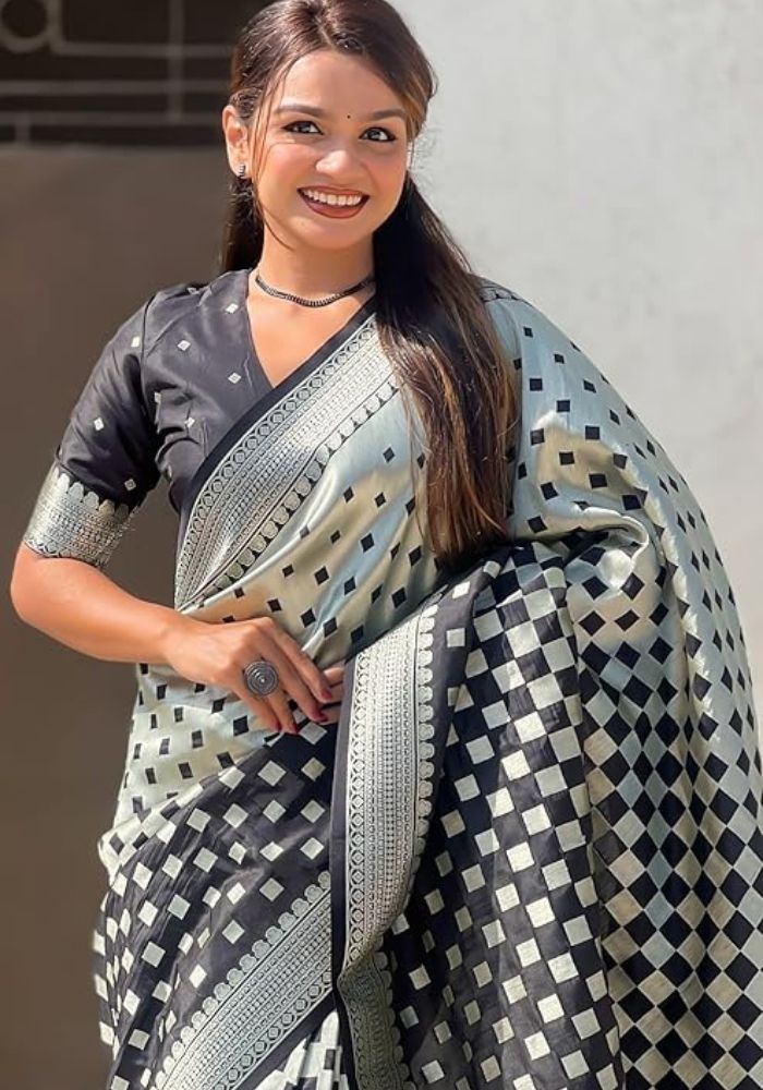 Designed for the discerning woman who revels in making a grand entrance, this saree strikes the perfect balance between timeless tradition and contemporary chic. The contrast-stitched blouse, rendered in deep black with hints of silver embroidery at the sleeves and neckline, complements the saree’s bold checkered body, accentuating your curves and lending a tailored finish to the ensemble.