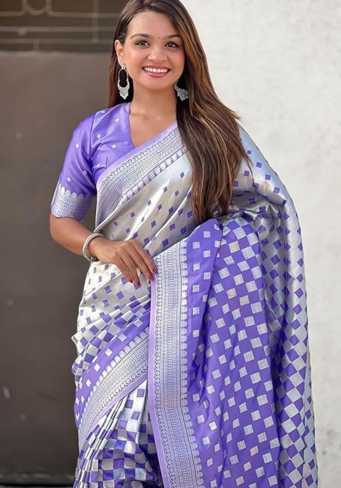 Immerse yourself in the enchanting allure of the Ishita lavender Banarasi Silk saree, where midnight-black silk meets glistening silver checks to create a tapestry of luxe sophistication. Each panel is meticulously woven with lustrous metallic threads, forming a rhythmic pattern of interlocking squares that dance with light as you move. A broad silver zari border, embossed with delicate floral and geometric motifs, frames the drape with an air of regal opulence, while the generously flounced pallu cascades like liquid silver, catching every flicker of illumination in its folds.