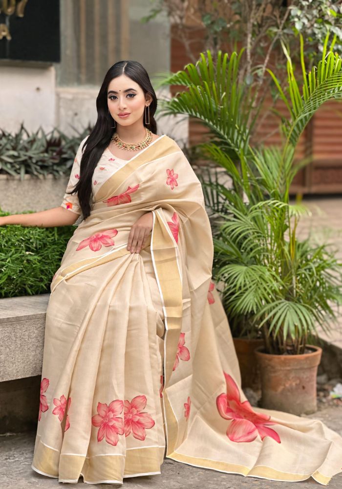 Grace meets charm in this stunning Jasmine Beige Tissue Silk Saree, delicately adorned with hand-painted floral motifs in shades of soft pink and crimson. The minimalistic base beautifully highlights the large blooms scattered across the drape, creating a perfect balance of sophistication and feminine appeal.
