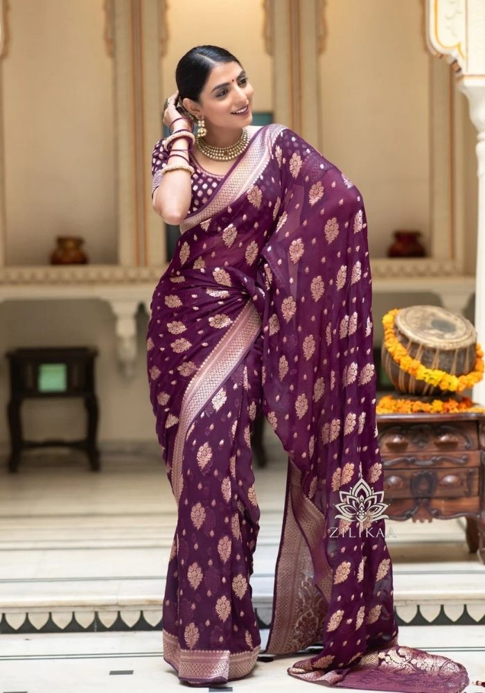 The woman in the image exudes grace and elegance, dressed in a luxurious Radharani Wine Banarasi silk saree—a timeless piece known for its opulence and intricate craftsmanship. The saree features rich golden zari motifs arranged in a uniform, symmetrical pattern across the body, showcasing the artistry of traditional Indian weaving. The fabric appears soft yet structured, providing a perfect fall that enhances the overall drape.