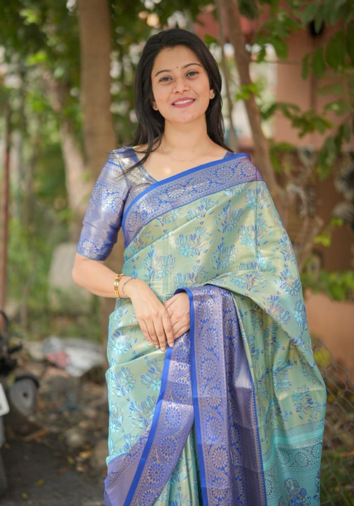 Unveil your ethereal charm with the Roopshree Red Kanjivaram Silk Saree , a breathtaking blend of grace and grandeur. This masterpiece features a refreshing mint green body intricately adorned with delicate floral and paisley zari motifs, each weave narrating a tale of tradition and finesse. The contrast border and pallu in vibrant gulabi pink bring the saree to life, highlighted with resplendent golden zari work that glistens with every movement.