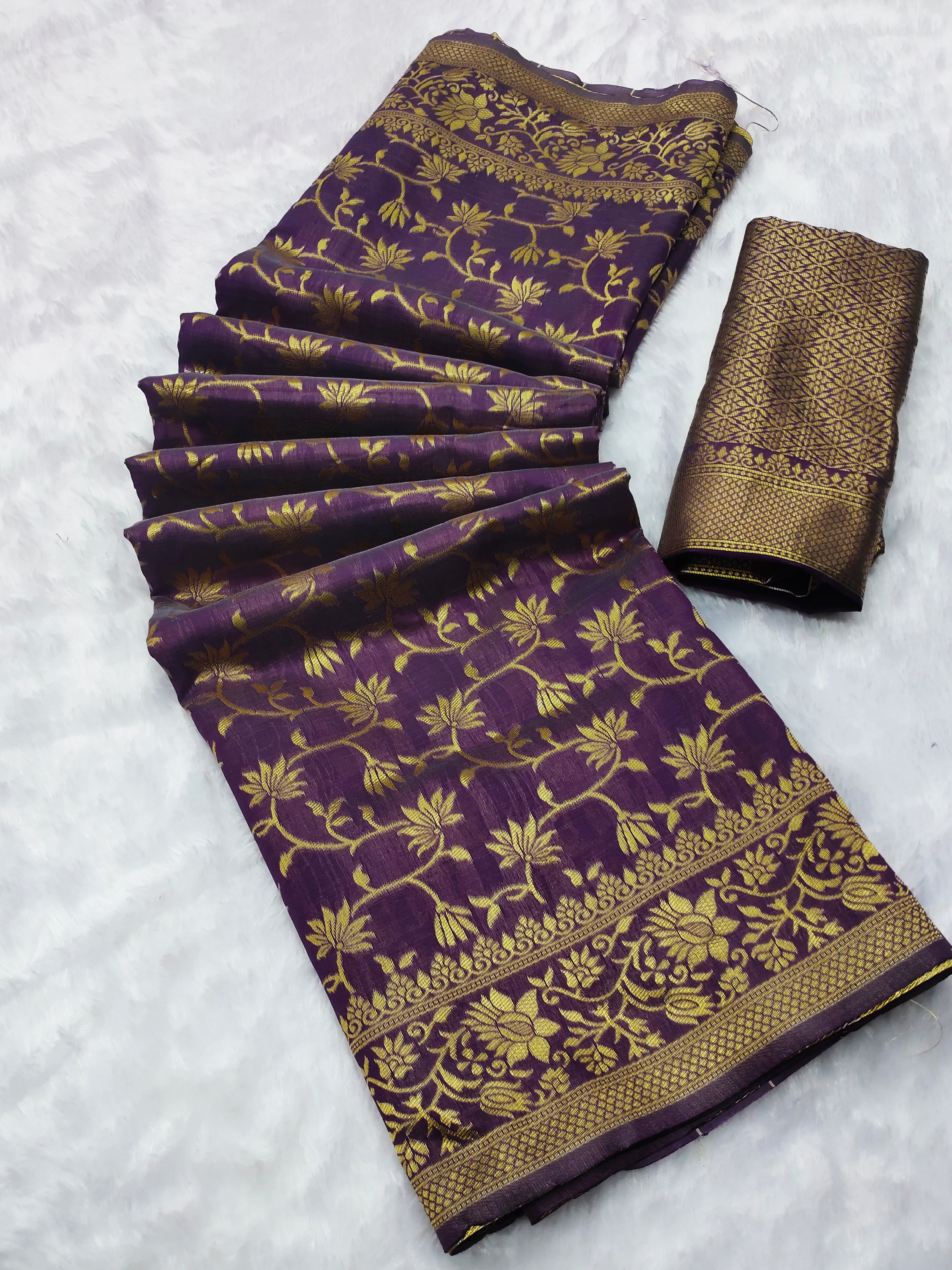Wrap yourself in soulful elegance with Ruhani, a breathtaking Plum Banarasi Silk Saree that blends tradition with timeless charm. The deep plum body is beautifully adorned with intricate golden zari floral motifs, radiating richness and grace. A finely woven golden pallu with traditional designs adds a royal finish, while the wide floral border enhances its grandeur. Paired with a matching blouse featuring zari detailing, Ruhani is the perfect choice for weddings, festive gatherings, and elegant celebrations. A saree that feels as divine as it looks – classic, graceful, and unforgettable