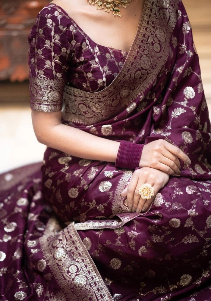 Step into a realm of regal opulence with the Pihu Wine Banarasi Silk Saree, a majestic blend of traditional artistry and timeless allure. Crafted in pure silk, the body of this saree radiates a rich, deep plum hue that serves as the perfect canvas for the intricately woven gold zari floral motifs. Each motif dances across the fabric with exquisite precision, catching the light to create a luminous effect that’s both graceful and grand.
