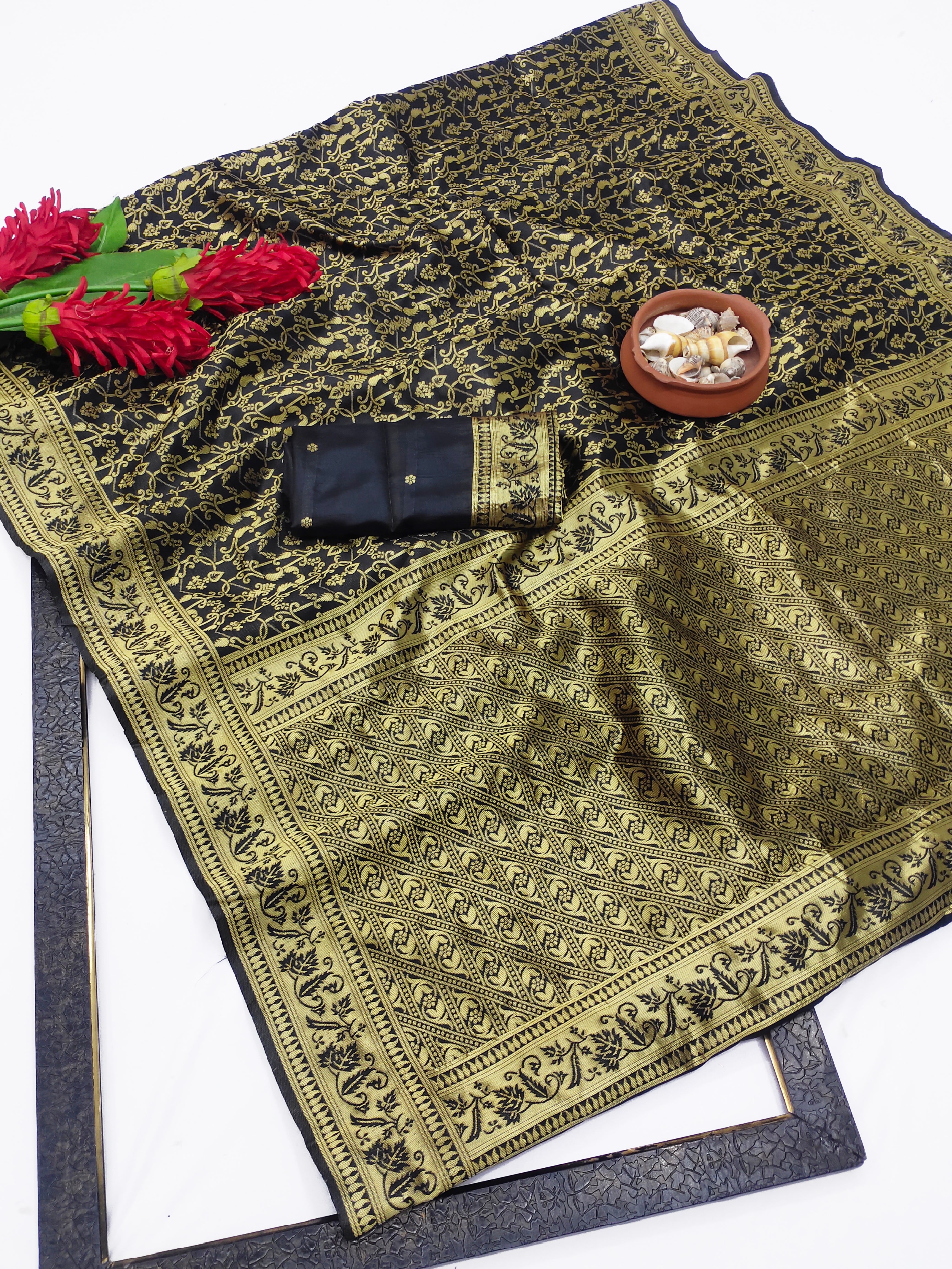 Evoke timeless tradition with Vedhika, a stunning Black Banarasi Silk Saree enriched with luxurious golden zari work. The deep black body is delicately adorned with floral and paisley motifs, bringing out the richness of heritage artistry. A grand pallu with intricate patterns and a wide golden border add depth and elegance to every drape. Paired with a matching blouse featuring zari detailing, Vedhika is perfect for weddings, festive celebrations, and special occasions. A true reflection of grace, heritage, and classic Indian beauty.